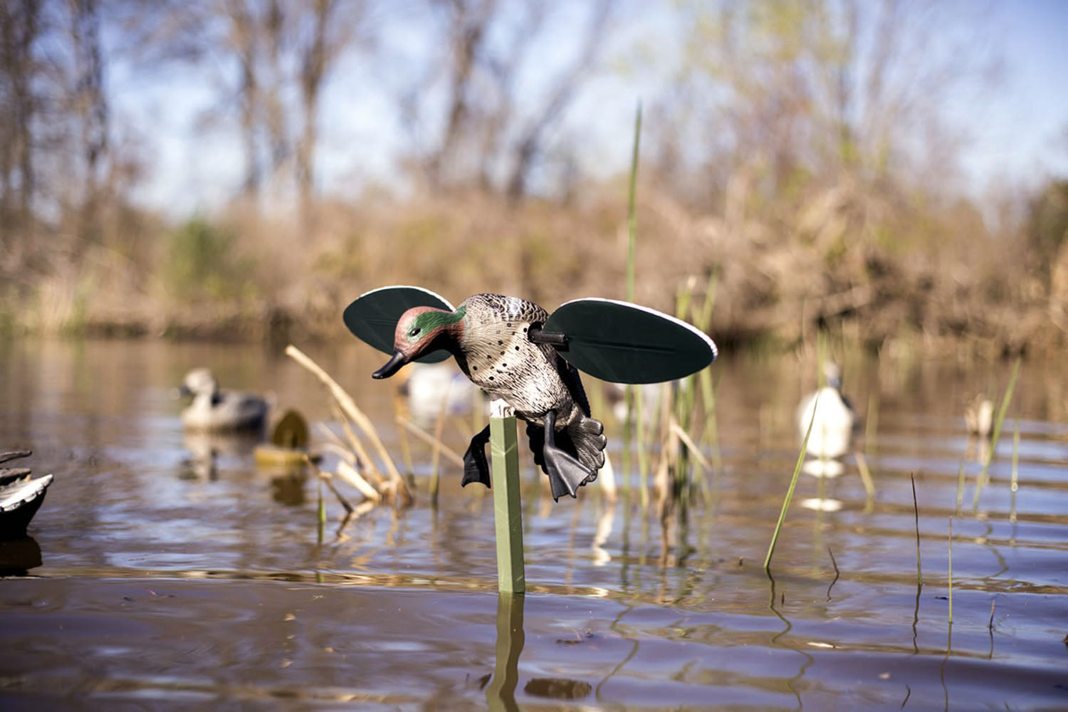 Atrapa rata mica Mojo mascul.Se foloseste cu succes la vanatoarea la pasaj la rata mare si rata mica.Montarea se face in locuri cu apa mica, pe malurile apelor sau chiar si pe camp. Se recomanda folosirea impreuna cu alte atrape.Contine suport metalic pentru fixarea pe sol.Material exterior flexibil si silentios.Culori foarte apropiate de coloritul natural.Compartiment separat pentru 4 baterii AA (nu sunt incluse).Aripi detasabile rapid.Picioare flexibile.