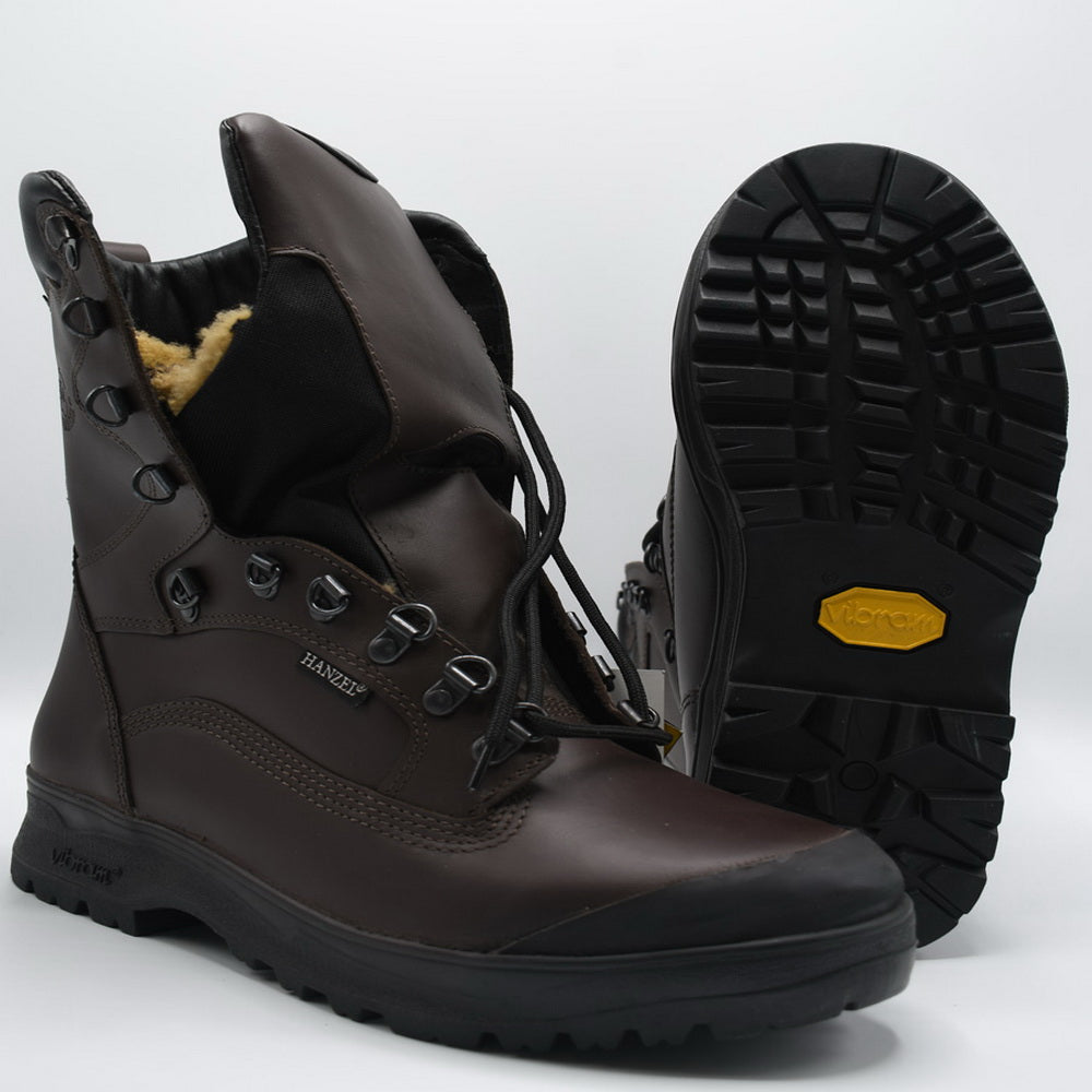 Bocanci Hanzel mod. Extremalny 012. Bocanci de iarna pentru vanatoare, drumetii montane, treking. - piele Box 2,6-2,8mm hidrofobizata; - izolatie Thinsulate 3M; - membrana Simpatex; - blana identic naturala (protejeaza pana la -30C); - talpa Vibram - absoarbe socurile si ofera aderenta sporita. Culoare maro.