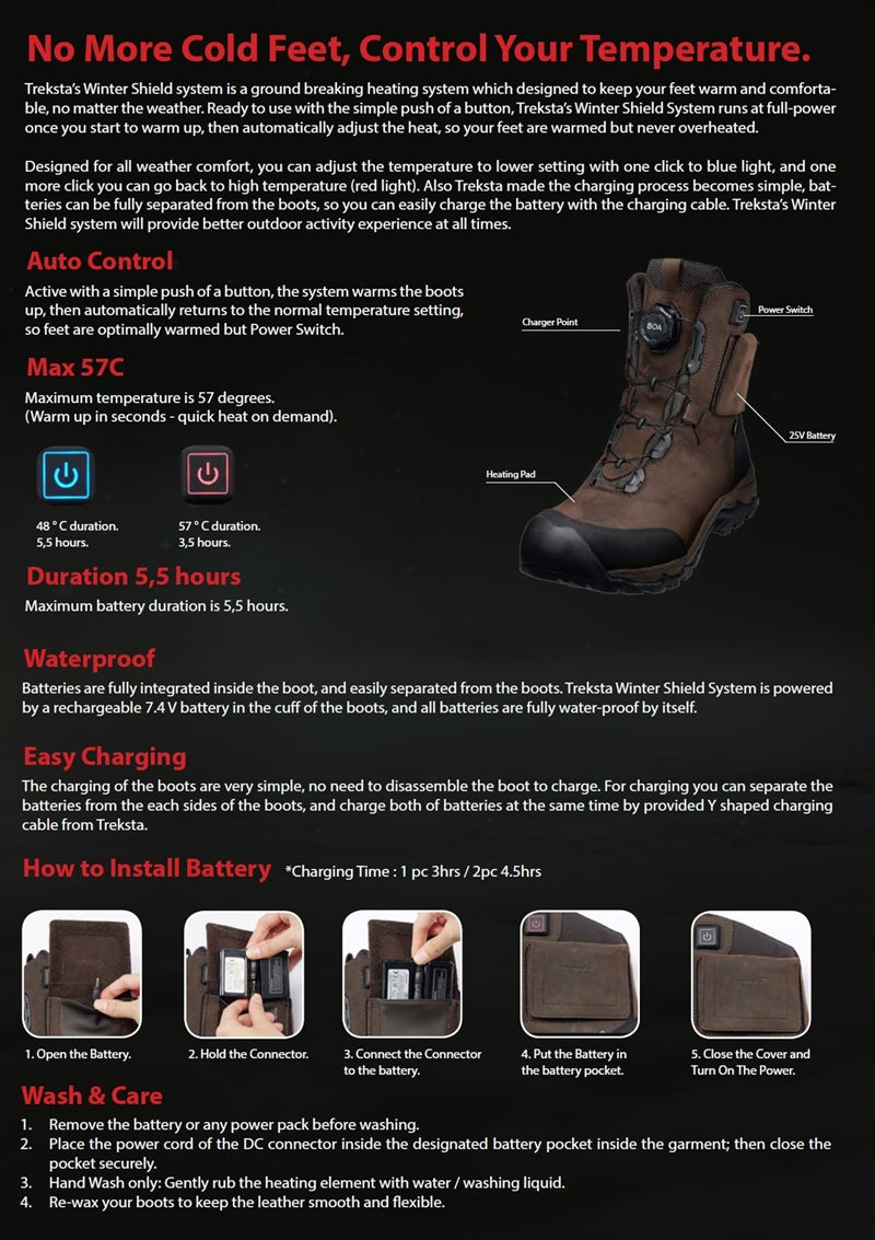 Bocancii au functie de control a temperaturii cu 2 nivele de incalzire.La prima apasare pe buton, in 5 minute se face preincalzirea bocancilor.La urmatoare apasare la o temperatura de 48grade bocancii pot rezista pana la 5,5ore, in timp ce la o temperatura de 57grade bocancii rezista pana la 3,5 ore. Astfel nu ve-ti mai avea probleme cu inghetarea picioarelor.Acumulatorii sunt Li-Ionde 7,4 v 1800mAh si incarcarea lor se face in 4-5 ore.Greutate: 820grame cu acumulator montat.