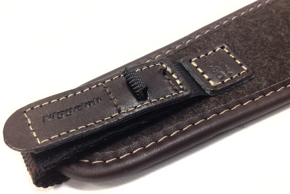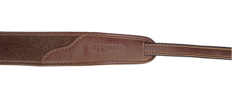 Curea arma Niggeloh din piele cu aplicatii Loden. Cureaua este eleganta si se preteaza pentru carabine cu patul din lemn. Culoare: maro inchis. Produsa de Niggeloh - Germania.
