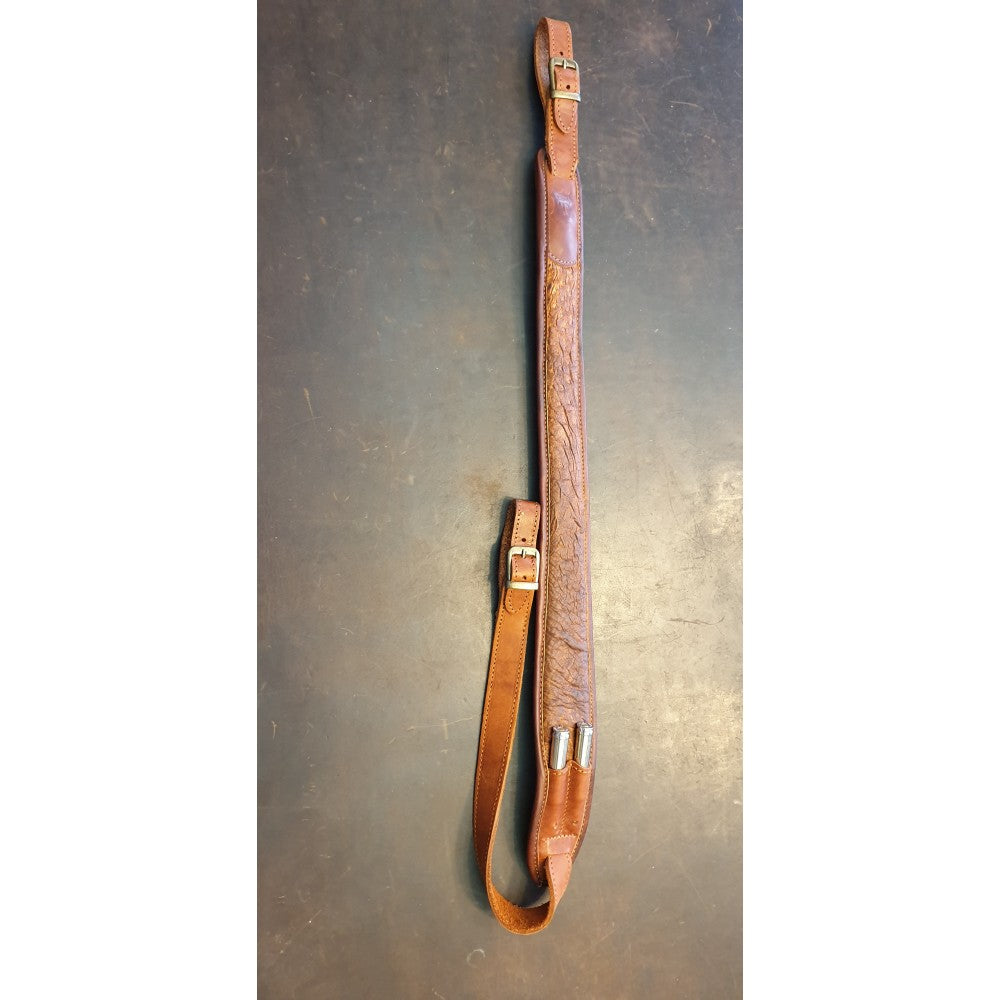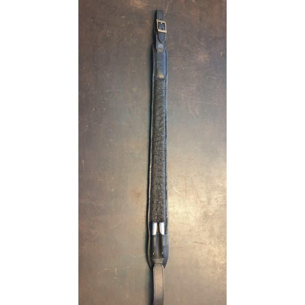 Cureaua este confectionata din piele de strut, cu accesorii metalice inoxidabile. Cureaua este foarte eleganta si prezinta loc pentru 2 cartuse. Culori: maro, verde, negru. Grosime: 2,5 mm - 3 mm. Latime: 25 mm. Lungime reglabila: 95-100 cm.