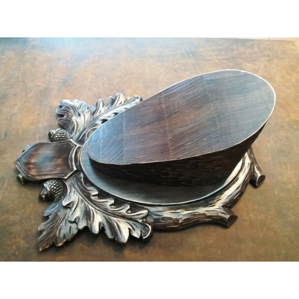 Panoplie pentru craniu de muflon. Dimensiuni totale: 38x26 cm. Dimensiuni utile: 25,5x12 cm. Inaltime butuc: 13 cm. Fabricat in Romania. Lemn de tei.